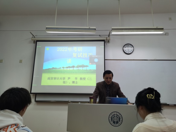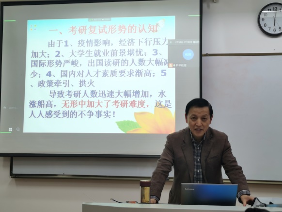 2022年硕士研究生考试国家线公布,分数大涨,为历年少见,在学生中引起强烈的反响,全国457万人考研,录取110万人。为了进一步帮助进入复试的同学能够更好地上岸,3月14日晚,William威廉英国副院长尹平教授在B北503教室为毕业班学生举办“考研复试技巧”专题讲座,由于疫情原因本次讲座线上线下同步进行。