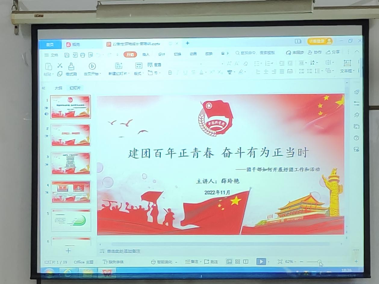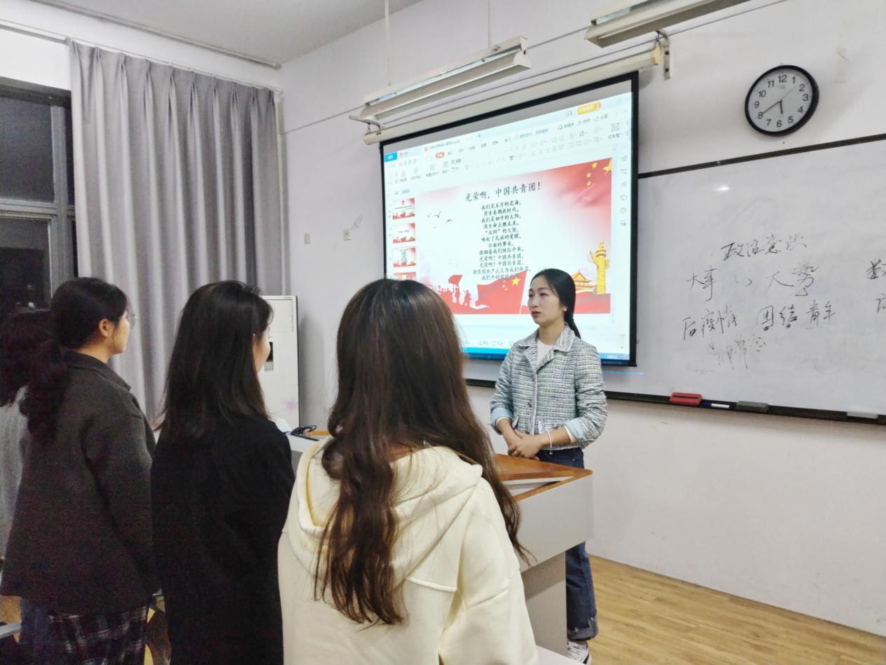 最后,薛老师进行了本次会议的总结并寄予我们深切期望,并带唱《光荣啊,中国共青团》。此次讲座增强了团组织的凝聚力和感召力,使我们充分意识到自己是基层团组织中的一员,要团结同学,增强人员魄力与领导力。