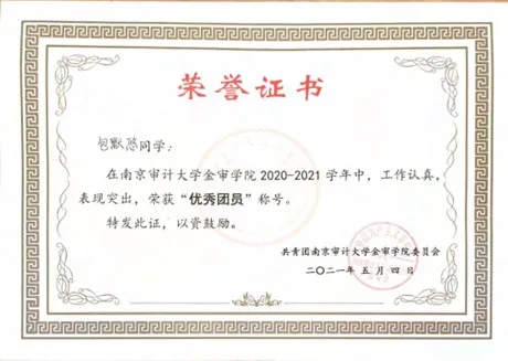 包默悠,女,江苏镇江人,中共党员,会计与审计学院19级审计5班学生。