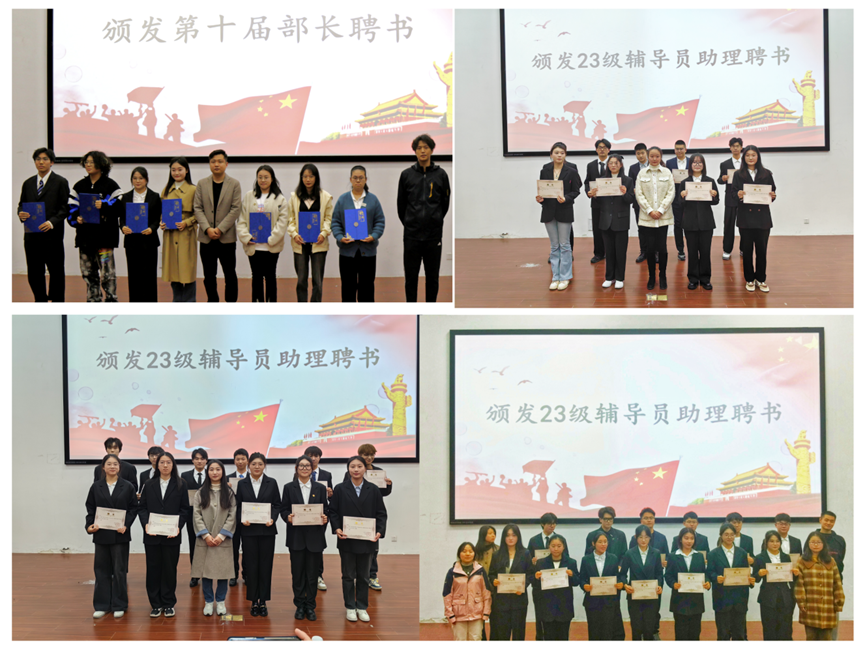 大学生活对于刚刚告别中学生活懵懂而无知的大一新生是陌生的,然而总有这样一群人来帮助他们适应大学生活,他们就是亲爱的辅导员助理。李芷莹同学代表23级辅导员助理上台分享自己在帮助大一新生适应大学生活的过程中的难忘经历,并且鼓励团学大一干事在大学书写自己璀璨的人生。随后,由教师代表为学院各班级的辅导员助理颁发聘书。