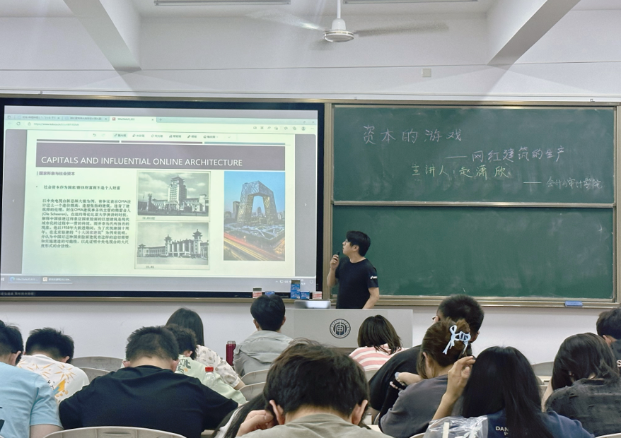 讲座活动以提问讨论的形式开始,“为什么会讨论‘网红建筑’这个话题?”赵老师从三个角度给予答案,一是建筑文化的组成部分,未来也会成为建筑史的一部分;二是不仅新建建筑可以网红化,历史建筑、历史街区也有网红化现象;三是与社会发展直接相关,与城市更新/乡村振兴相关。而这三个角度也与金融发展、社会变革息息相关。同学们从讲座中了解到资本、政治、文化、社会多方面对建筑的影响,以及引申所在专业中所涉及的与乡村振兴发展、绿色金融相关的内容可以继续探索的方向,并从社会文化、艺术审美方面来思考推动经济发展的新方向。