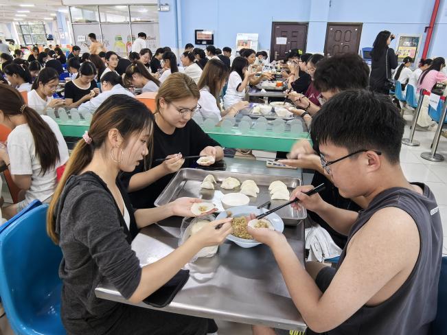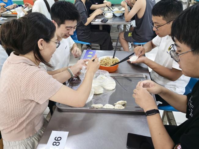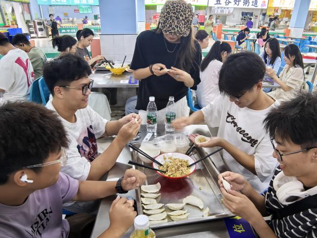 辅导员助理、教官和同学一起包饺子