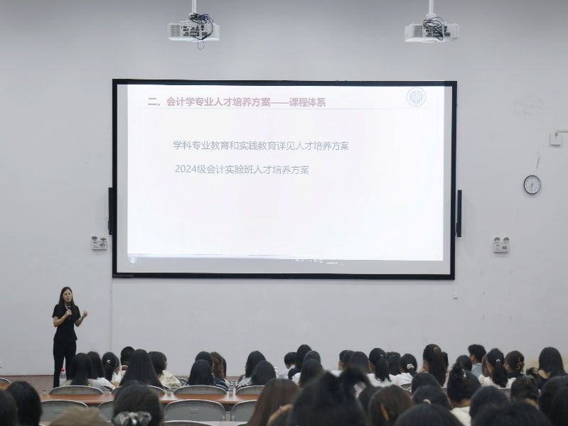 讲座上,胡院长分别从会计专业的核心课程体系、职业发展与就业前景等多个角度进行了全面的阐述。她强调,会计作为一门应用性极强的学科,不仅要求学生掌握扎实的专业知识,更需具备良好的实践能力和创新思维。此外,胡院长还为新生们分享了众多就业方向,并鼓励新生们在校期间要准备会计专业学生所需要考取的证书,充分利用大学4年时间提升自己在专业和人格塑造方面的能力,为将来走向社会添砖加瓦。