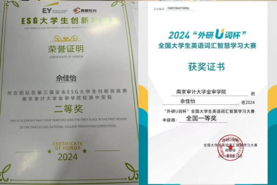 她也积极参加学校各项比赛并取得相应的奖项,例如在2024“外研U词杯”全国大学生英语词汇智慧学习大赛中获得全国一等奖,ESG大学生创新挑战赛的校赛二等奖以及校园商赛优秀奖等奖项。