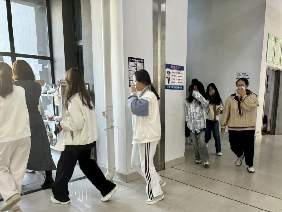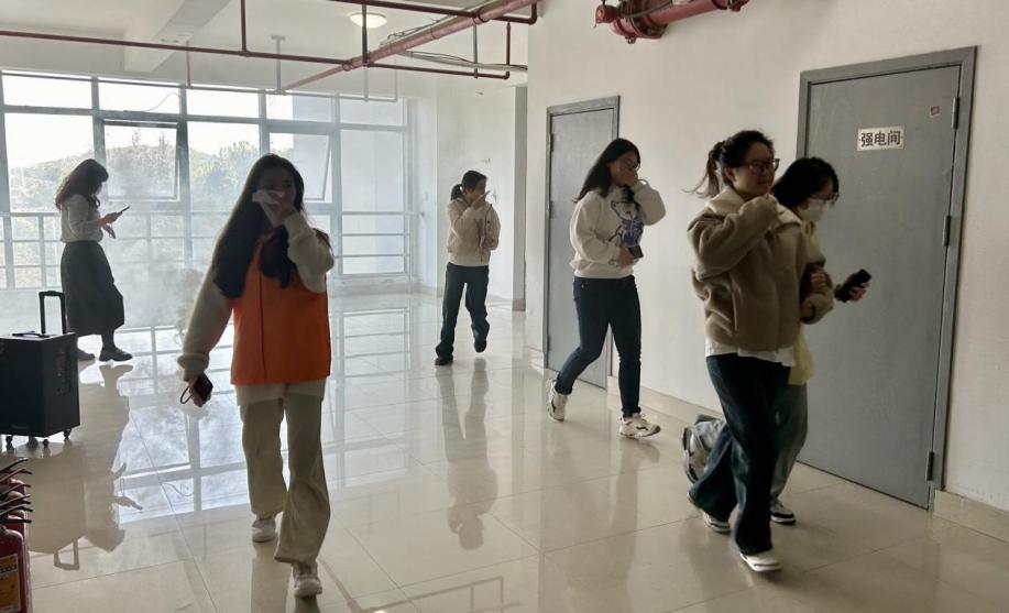 演练开始,火警警报响起,所有同学迅速离开房间,在工作人员引导下弯腰前行,用湿毛巾捂住口鼻,按照方案撤离至安全地带。同学们全程服从指挥、互相配合,无任何推挤、踩踏、受伤、缺员等情况,疏散演练过程井然有序,达到了预期目标。