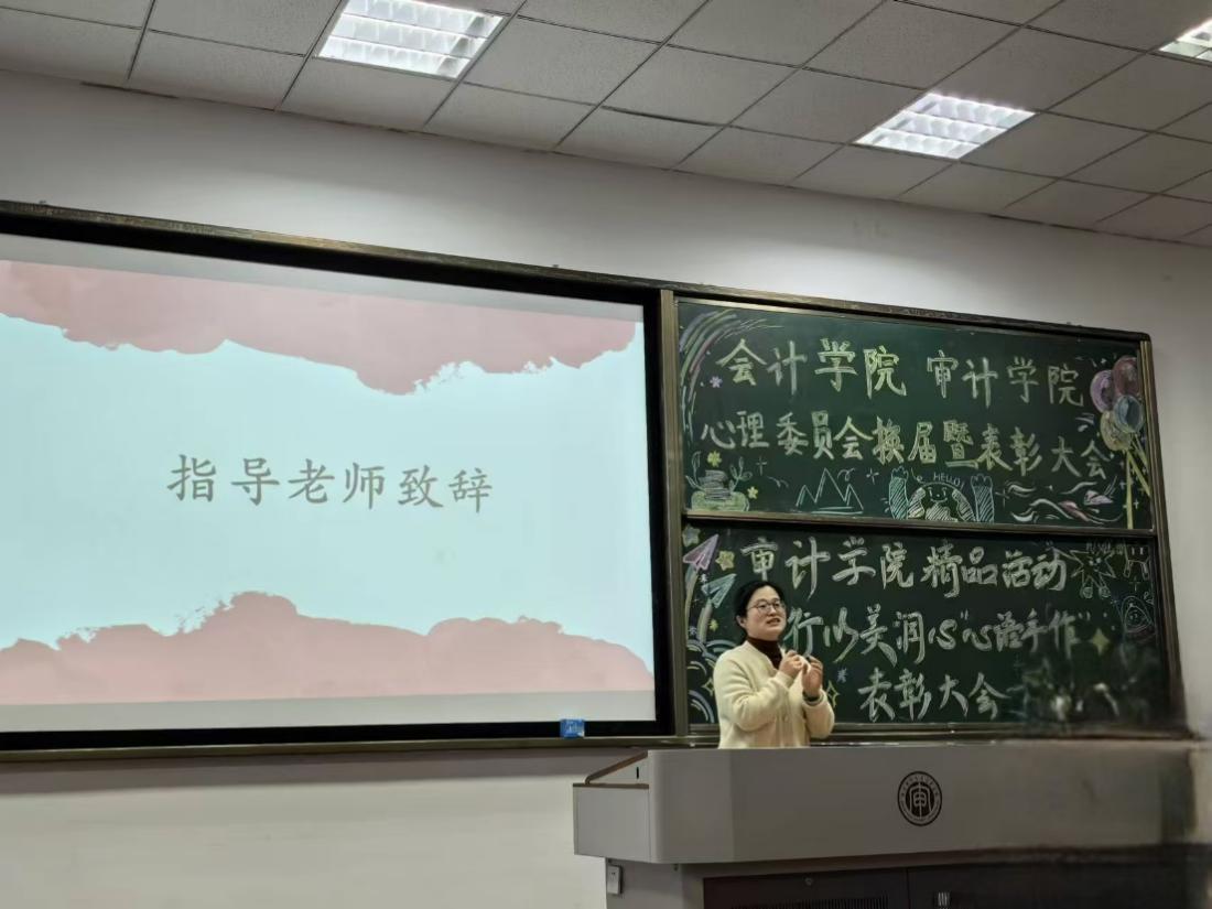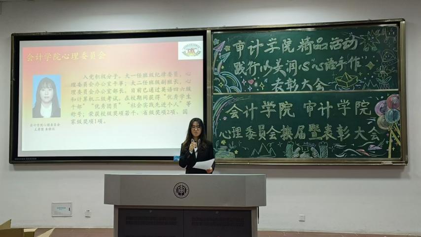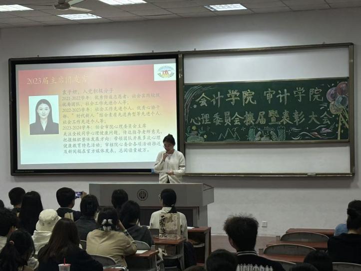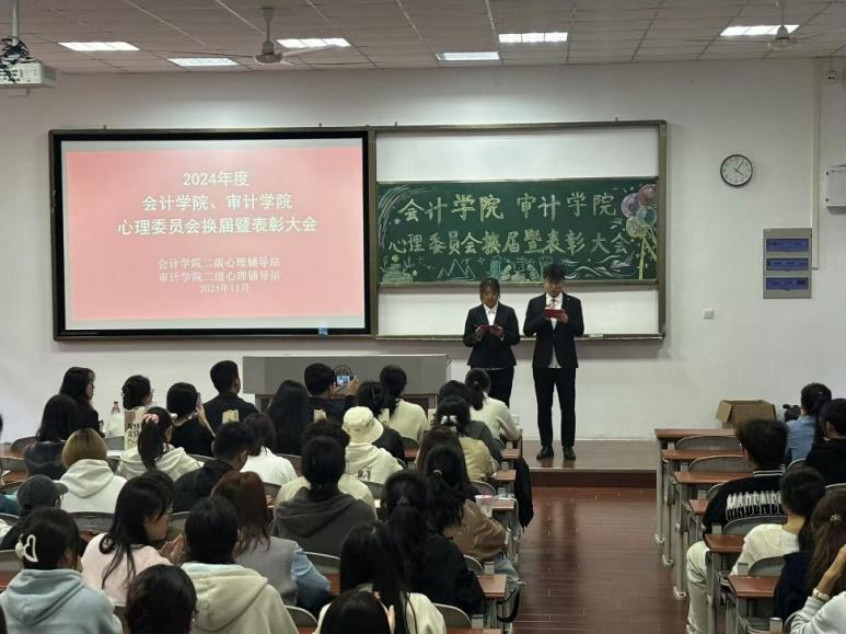 为总结和表彰过去一年在心理工作领域取得的成绩,2024年11月13日下午,williamhill英国心理委员会于C南101教室召开了2024年度二级心理辅导站换届暨表彰大会。校心理中心主任朱晓庆、审计学院党总支书记庄怀军、审计学院心理委员会指导老师曹剑、williamhill英国心理委员会指导老师吴佳倩及williamhill英国心理委员会全体成员出席本次大会。大会分为:介绍心理委员会组成、回顾历届工作、表彰上届主席团及各部门负责人、学生代表发言、领导和老师代表致辞五个环节。