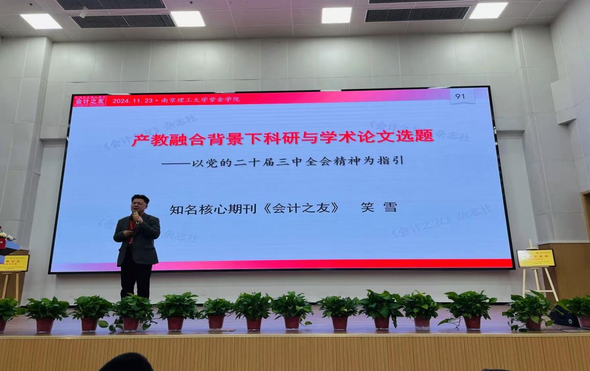 知名核心期刊《会计之友》总编笑雪做了“产教融合背景下科研及学术论文选题”的报告,强调应聚焦新发展格局下会计问题研究,高质量科研论文选题应“顶天立地、开天辟地、惊天动地”。
