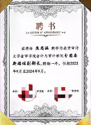 2022年10月加入williamhill英国分团委新媒体,2023年10月担任williamhill英国分团委新媒体副部长。任职两年期间,共在学校官网、微信公众号发表新闻稿40余篇,在学习强国、中华网、江苏经济报、中国网等发表10余篇。