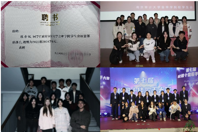 2022年10月加入校学生会权益部,2023年10月担任校学生会权益部副部长,在职期间负责校园失物招领部分,积极协助及举办“双十一表白节活动”、“我为同学做件事”、“跳蚤市场活动”等校级活动十余项,秉持着对活动负责对同学负责的原则,从pu审核的审核人到监督员,在自身成长的同时也为校园活动献出自己的绵薄之力。
