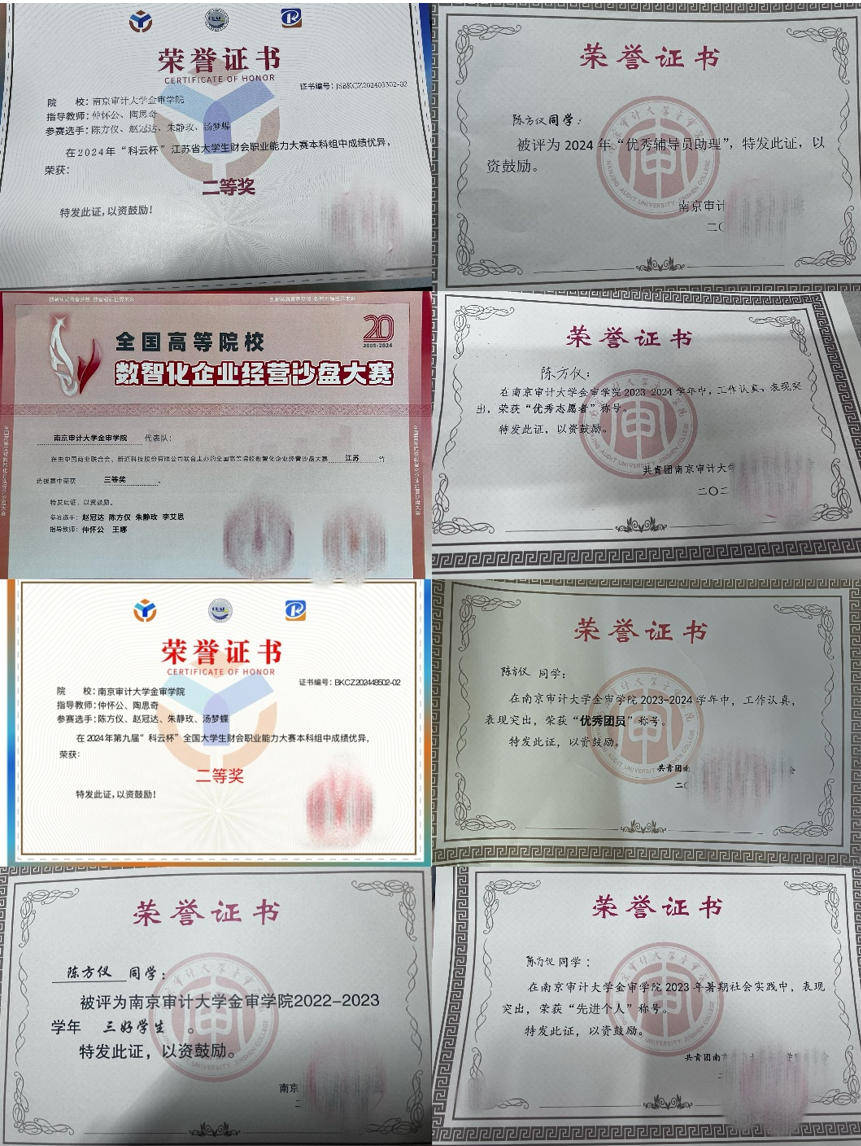 在学习上,始终牢记学习是学生的本职工作,在过去的两年中,立足自己的专业,广泛涉猎学科知识,在2022-2023学年绩点专业排名第四,综测第六,2023-2024学年绩点专业排名第二,综测第三,积极参加各项比赛,所在团队获得数智化企业经营沙盘大赛江苏省三等奖、2024年第九届“科云杯”全国大学生财务职业能力大赛江苏省二等奖、2024年第九届“科云杯”全国大学生财会职业能力大赛本科组二等奖。同时正主持一项校级大创。