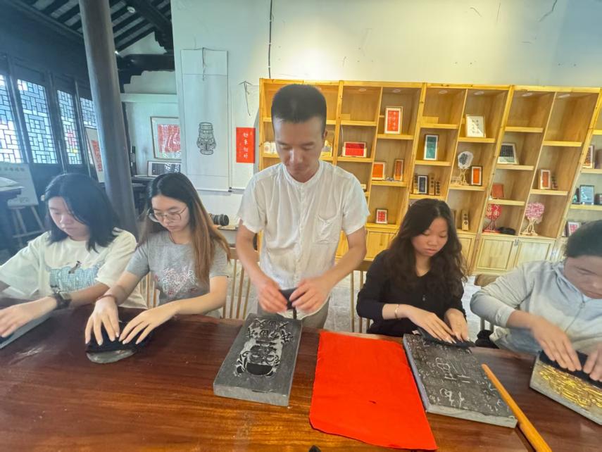 实践团队深入嘉兴地方文化现场,先后走进乌镇与月河历史街区,亲身体验蓝印花布与墨育传拓两项非遗技艺。队员们学习蓝印花布的传统印染工艺,从刻版、刮浆到浸染、晾晒,每一道工序都需耐心与匠心。大家亲手制作花布方巾,在实践过程中与非遗传承人深入交流,了解这项技艺的保护现状与创新应用。在老师指导下,成员们细心铺纸、蘸墨、扑打,将碑刻文字与图案清晰地拓印于纸上。“这不仅是一次手艺体验,更是一场与历史的对话,”队员在完成作品后表示,“透过拓片,我们触摸到了文化传承的具象形态。”