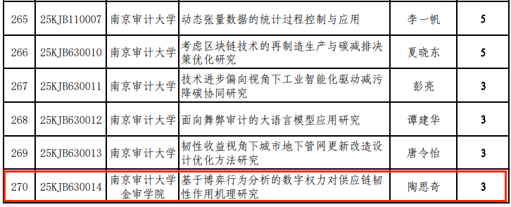 近日,江苏省教育厅公布了2025年度高校基础科学(自然科学)研究项目立项名单。我院陶思奇老师主持申报的课题《基于博弈行为分析的数字权力对供应链韧性作用机理研究》(项目编号:25KJB630014)成功获得立项。