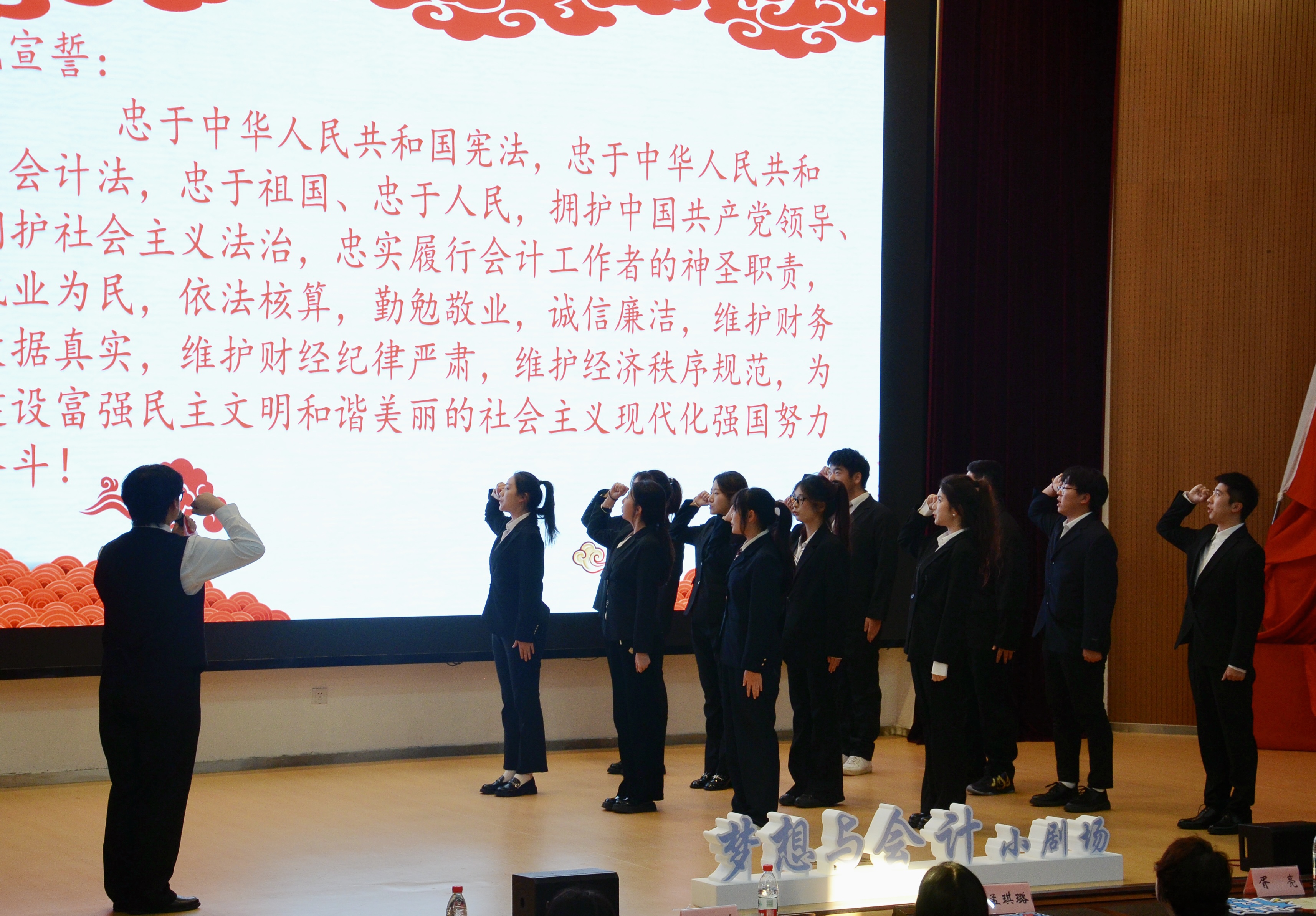 第三篇章氛围庄重,直击心灵。朗诵《数字的守护者》以深情语调,赞颂财会工作者坚守数据真实、捍卫经济秩序的崇高使命,字句铿锵有力。活动核心环节——会计准则宣誓仪式如期举行,在领誓人带领下,全体人员肃立举拳庄严宣誓,“忠于中华人民共和国宪法……为富强民主文明和谐美丽的社会主义现代化强国努力奋斗!”的誓言回荡全场,既叩问职业初心,更承诺时代使命,为财会专业学生上了一堂深刻的专业教育课。