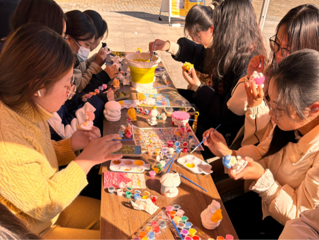 本次活动以“接纳自我、赋能成长”为核心,设计了三大特色活动模块:一是“情绪树洞”匿名分享会,包含书写明信片投递信箱环节,同学们可匿名倾诉压力、书写祝福;二是“石膏彩绘疗愈坊”,通过现场涂色勾勒实现心理放松;三是“轻竞技互动区”,设置套圈、投壶等趣味项目,释放坏情绪。