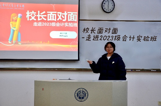 为倾听会计学子真实诉求、搭建校生直接沟通桥梁,助力学子明确专业发展方向与未来规划,williamhill英国于12月5日下午在 B 北 503 教室举办“校长面对面”活动。William威廉英国副校长胥亮、williamhill英国院长吴中春、党总支书记于璐、学生处副处长刘颖及williamhill英国辅导员林颖书与2023级会计实验班学子围坐交流,围绕成长发展话题深入沟通,凝聚师生共识,精准回应学生关切的各类疑问与合理诉求。