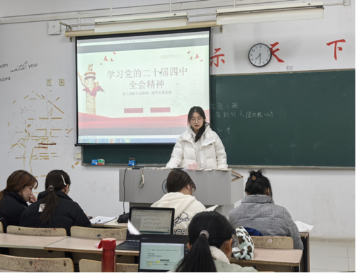 各团支部聚焦习近平总书记重要贺信精神、党的二十大精神及党的二十届四中全会精神,紧扣“学思想、强信念、践行动”的核心目标,构建“理论铸魂+实践赋能+成效转化”三维育人体系。围绕党的二十大提出的“以中国式现代化全面推进中华民族伟大复兴”的中心任务,以及全会提出的“推进中国式现代化”“激发经营主体活力”“发展全过程人民民主”“构建高水平社会主义市场经济体制”等重大战略部署,原原本本学习全会公报、重要决定及权威解读材料,确保学深悟透、融会贯通。