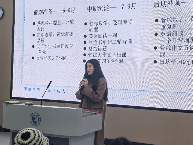 活动伊始,刘秀全老师围绕研究生考试报考专业类别、涉考科目及难度对比等核心内容展开简要介绍,为在场学子筑牢备考理论基础。随后,经验分享环节正式开启。姜磊学长以时间轴为脉络,系统梳理不同备考阶段的核心要点,尤其针对英语科目着重强调“以单词为核心”的备考逻辑,建议通过高度凝练的词汇横纵对比构建知识体系,抢占备考优势;同时提出管综备考需坚持“精学多练”,强调知识点学习后需通过大量刷题巩固记忆,杜绝“自我认知偏差”导致的复习漏洞。