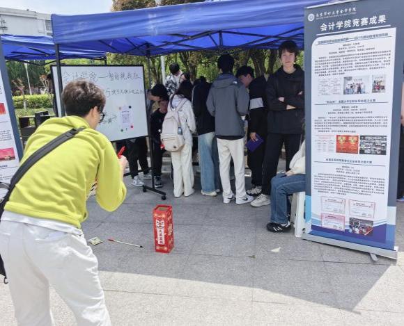 本次活动紧扣主题精心策划,设置核心展示区、互动体验区、信息服务区三大功能板块,全面呈现学院竞赛培育成果与赛事资源。核心展区集中展示社团建设成果、历年竞赛荣誉与获奖证书,直观展现学子在全国商业精英挑战赛、“科云杯”财会职业能力大赛、智能财务管理及大数据应用技能大赛等高水平竞赛中的优异表现,工作人员现场讲解竞赛培育体系,传递学院以赛育人的专业实力。