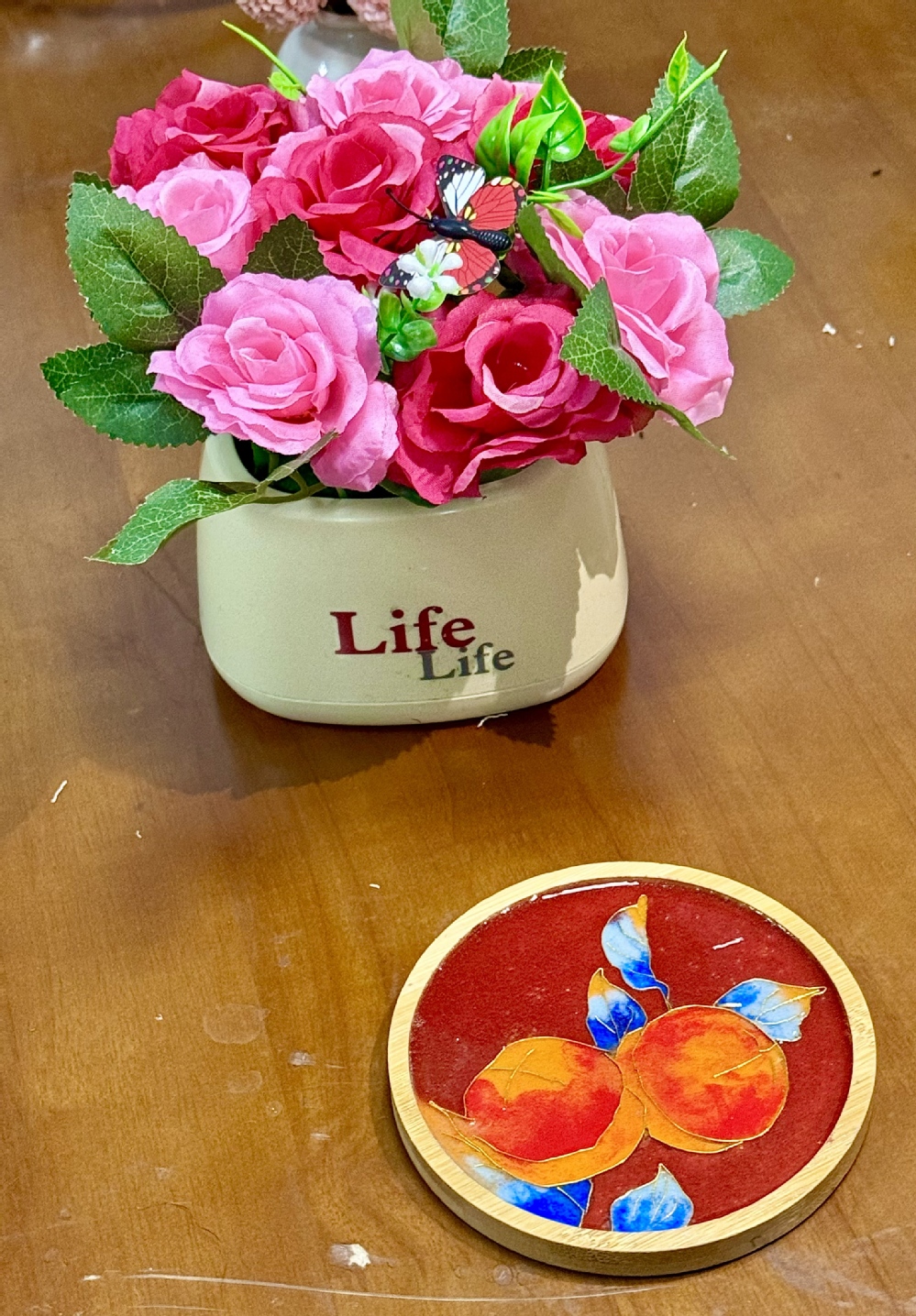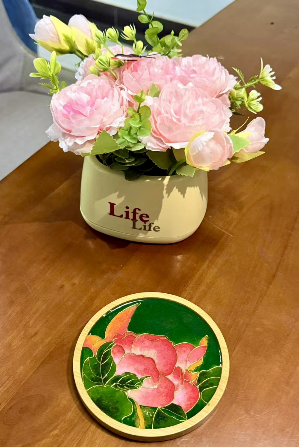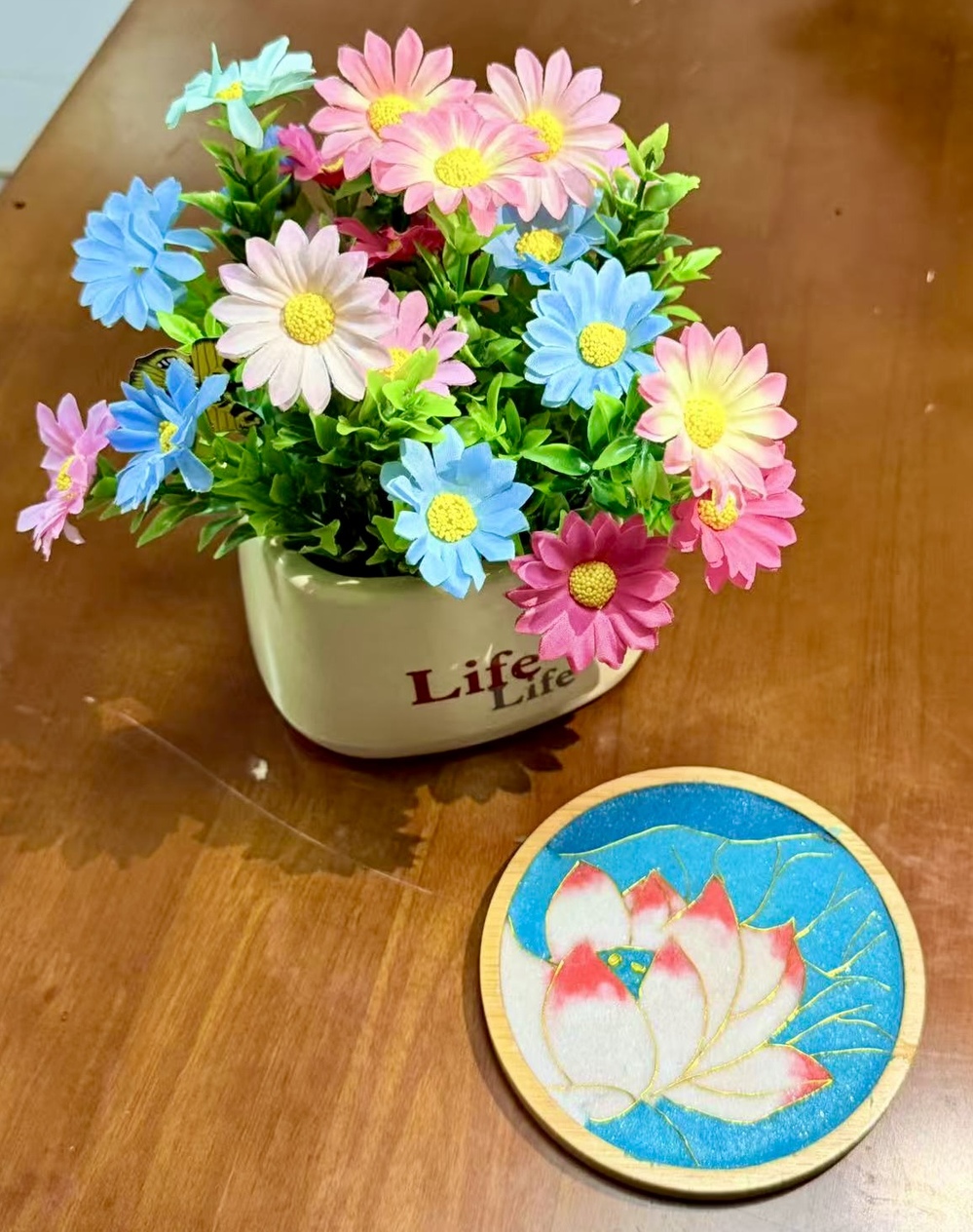 在掐丝珐琅杯垫体验区,非遗文化的魅力与春日的温柔相得益彰。同学们手持镊子,将细如发丝的铜丝精心弯折,勾勒出烂漫花朵、灵动星芒与可爱的卡通纹样,再以彩釉细细填色。慢工细作之间,思绪渐渐放空,浮躁被指尖的专注一点点抚平。不少同学感慨:“在掐丝填砂的过程中,感觉所有的焦虑都被抚平了,只剩下专注和宁静。