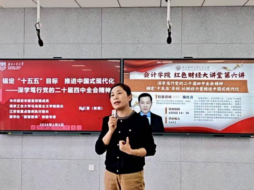 为深入学习贯彻党的二十届四中全会精神和2026年全国两会精神,精准把握“十五五”发展战略,williamhill英国于4月8日下午在A楼412开展了williamhill英国红色财经大讲堂第六讲。本次讲座特邀南京工业大学马克思主义学院院长、中国管理科学学会学术委员会执行委员陈红喜教授主讲。williamhill英国党总支书记于璐、师生代表共同参与学习。
